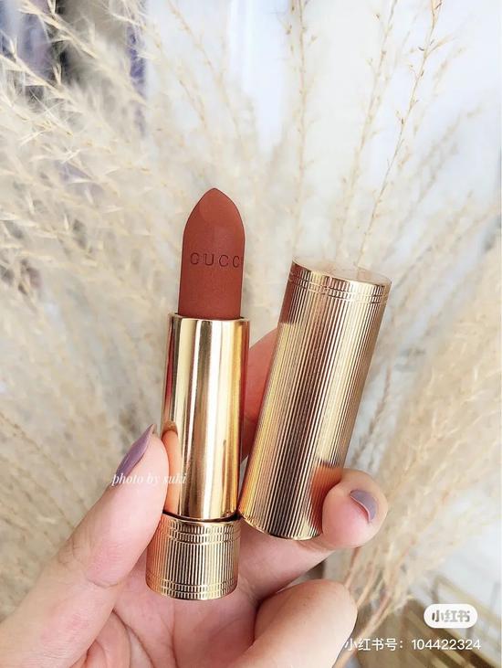 这是GUCCI哑光系列口红的一支限量版新色,包装就是贵气十足的螺纹金属外壳,打开会发现膏体色泽浓郁,看起来时髦又复古。