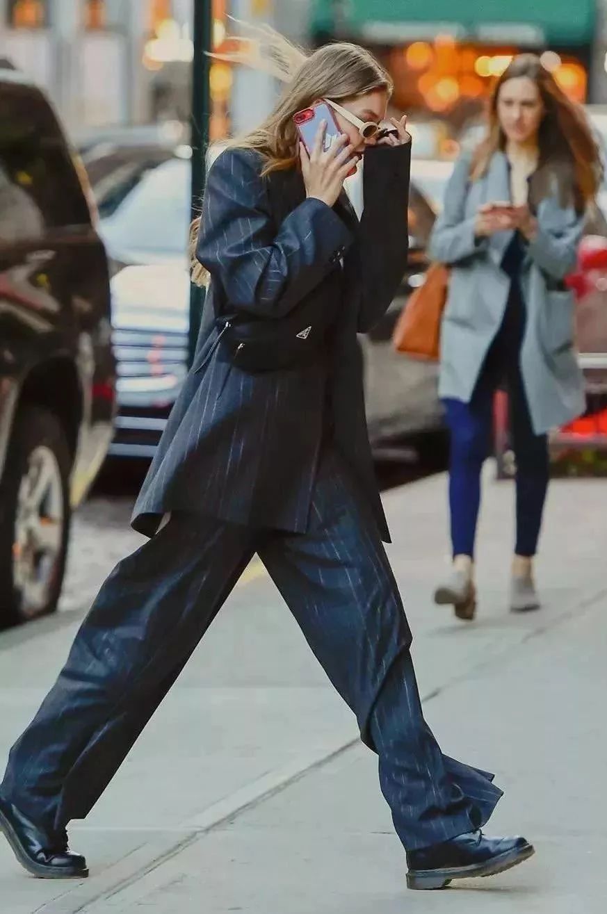 Gigi近日出街的look就是一身条纹西服,
