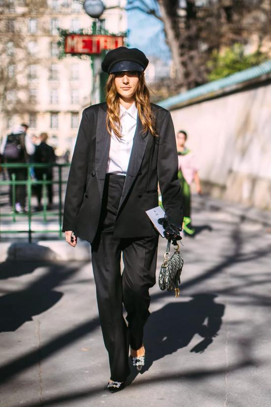 黑色西装内搭白色衬衫可以直接通勤穿,想要下班以后看起来不那么严肃,或许可以试试搭配一顶报童帽哦。