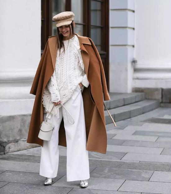 天气再冷一些可以选择利落剪裁的长大衣,报童帽的中性感会稀释掉一部分过于女性化的感觉,又A又美也就是这种感觉了。