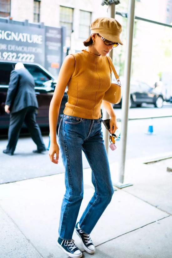 前几天被传怀孕的Kaia这套上半身基本都是同色系搭配,无袖针织衫、腋下包、报童帽都是百搭小能手呢。