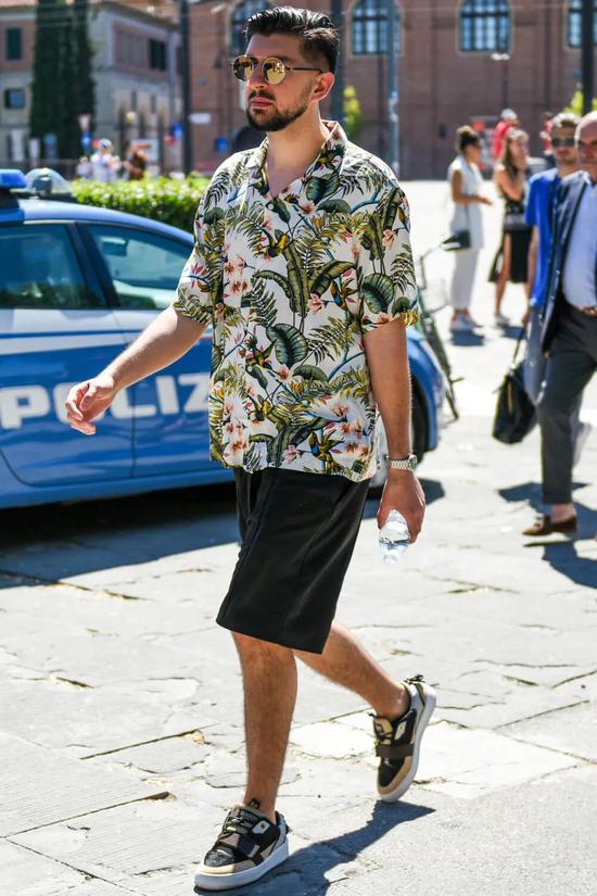一旦花衬衫、短裤都过于修身的话,因为花纹图案的关系,整体给人的感觉就会显得逼仄许多,不够大方利落而显得土气。