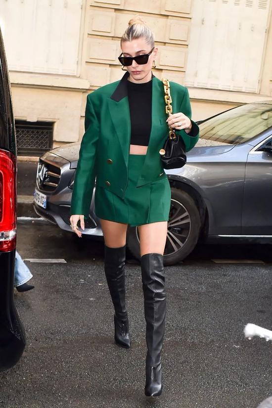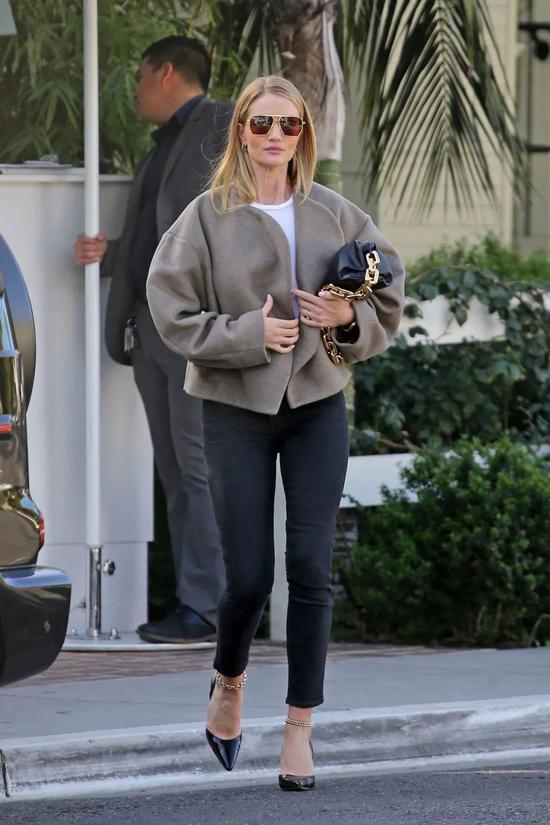 脚踩厚底靴,直接手拎,特别随性飒爽,难怪这么多人排队也想买了。