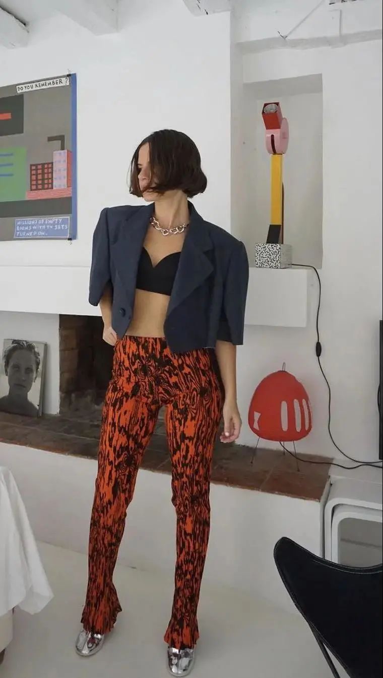 很多时装博主对这些短款西装爱不释手,例如时尚博主Marta Cygan,就很爱穿短西装,下面搭配高腰牛仔裤、印花裤,或者里面搭配非常亮色的Top来彰显自己的搭配功底。