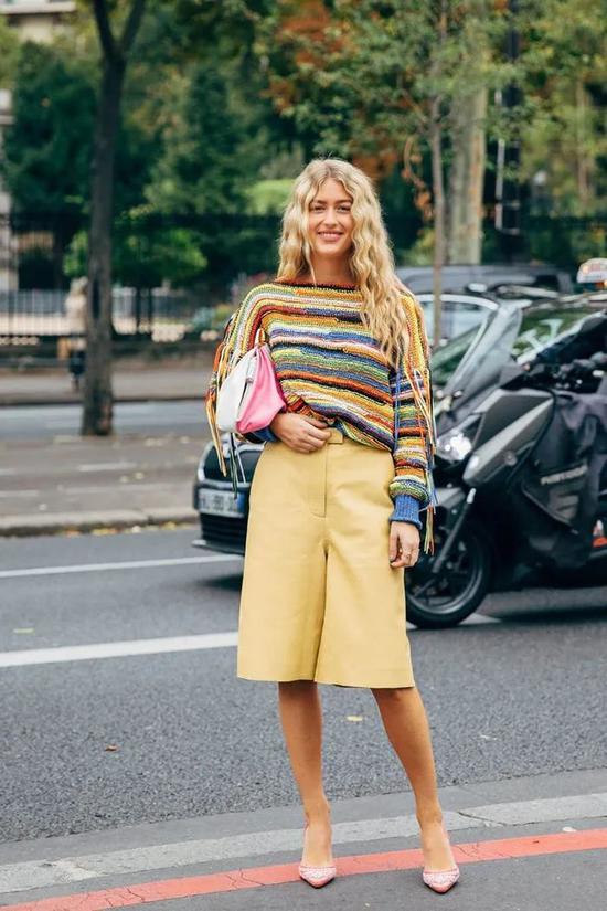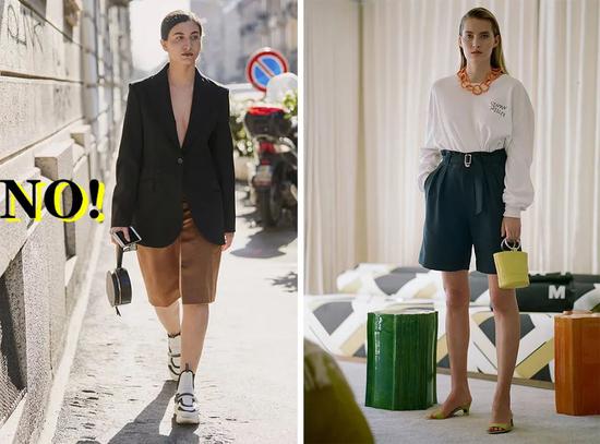 就算没有太短款的上衣,也要通过解开扣子等各种方式来露出腰线,如果臀部和大腿是有肉的,那你的百慕大短裤就要跟着变宽松才行。记得,鞋子一定选能多露出脚面的款式,因为,露出来的脚都算腿长。