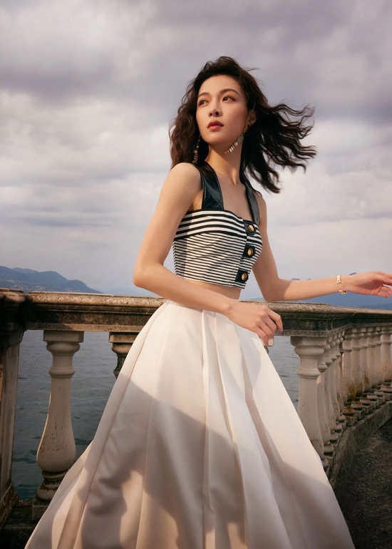 海军风黑白条纹上衣增添皮革宽肩带和金色纽扣,搭配白色百褶裙与蓬松的细羊毛卷发型,充满惬意的海岛风情。