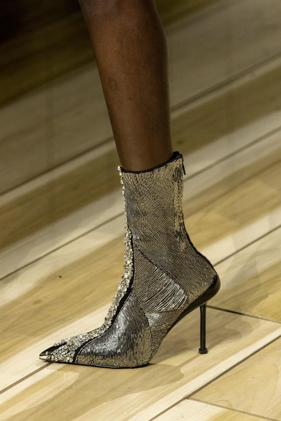 与Alexander McQueen一样令鞋履成为华丽艺术品的还有Balmain 2023早秋系列,大面积的水晶切片如同流苏一般布满时装与鞋履,闪耀着流动的光芒,除了未来感,金属光泽也能为时装带来优雅气质。