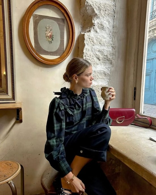在冬日的叠穿体系里,格纹内搭是打造层次感的秘密武器,能让简单造型瞬间变得饱满立体。格纹衬衫作为内搭全能选手,较为经典的穿法是叠在毛衣里面,领口袖口露出些许边缘,打破纯色毛衣的单调。
