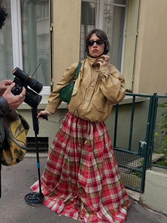 这种叠穿玩法还能再升级——直接把格纹半裙套在长裤外面。不过博主出片可以随性发挥,日常穿着还是选材质轻盈、有高开衩的半裙更合适,视觉上会让身形比例更加舒展。