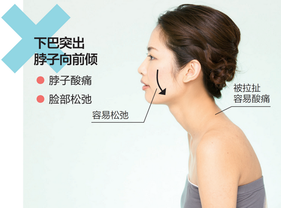 过分注重保持良好的姿势,而导致下巴被过度牵引的状态。多见于喜欢挺胸的人。形成双下巴,脖子上有很多皱纹,经常咬紧槽牙。从耳后连接到锁骨的,位于脖子外侧的肌肉、胸锁乳突肌容易酸痛。