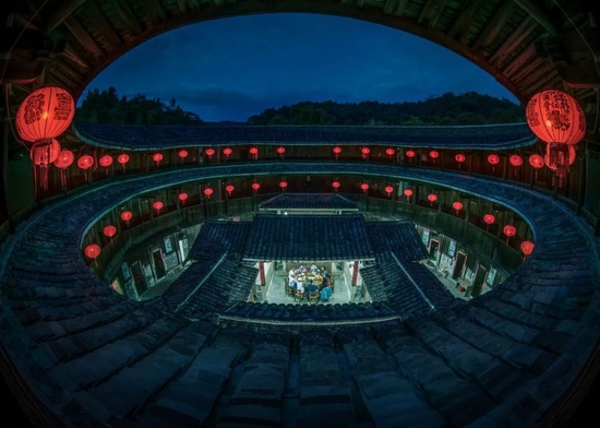 到了晚上,红灯笼高挂的土楼,挤满了一缕一缕的温馨。